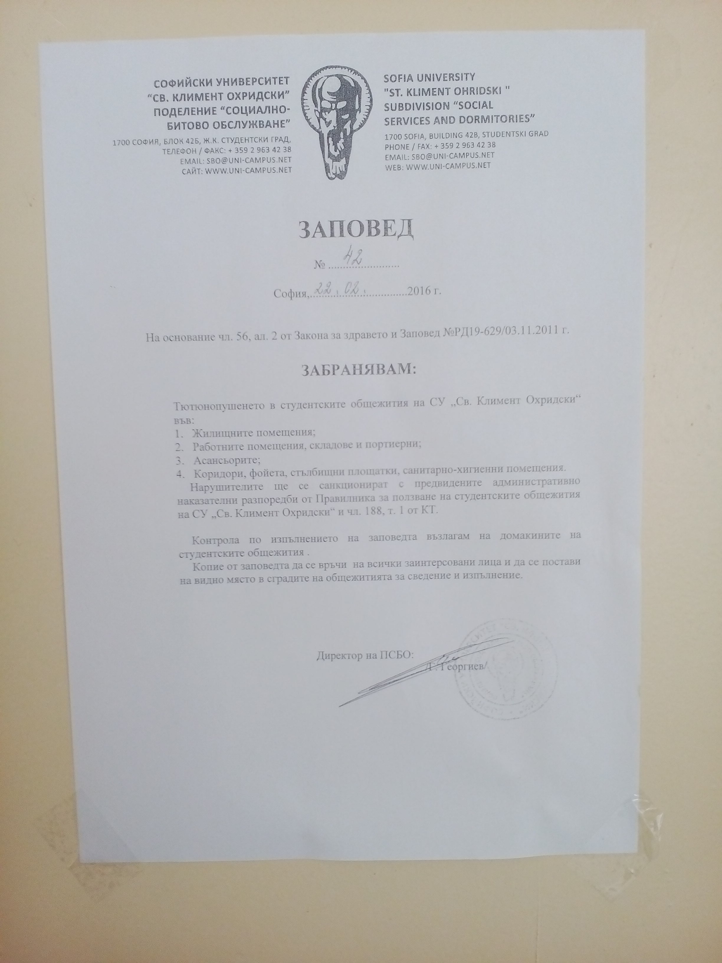 Началният ентусиазъм на самозабравилото се ново шефче, объркало тона при комуникация със студентите, ме удари от вратата тази нощ. Буквално. „От днес вратите се заключват в 12 и се отварят в 8. Никой не излиза. Мога само аз да пускам хората. Такива са нарежданията.“ ми съобщи портиерката. Изключително смела глупост от страна на новия директор Георги Георгиев.