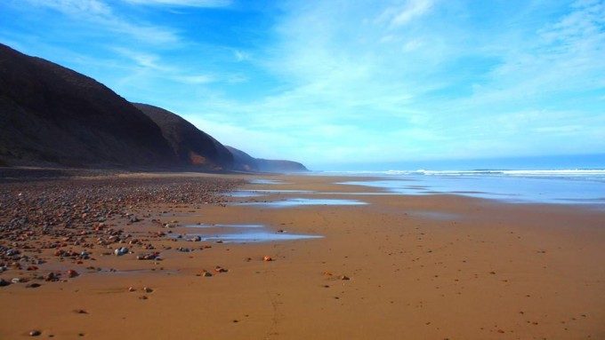 В Тизнит висях между пет и седем сутринта, докато се качих на автобус за Sidi Ifni. Девет километра преди градчето слязох насред пътя, спуснах се по неасфалтиран път към океана и се озовах на дългия няколко километра, широк, чист и пуст плаж, Legzira. Срещнах всичко на всичко трима души и четири-пет кучета; отдалеч видях двама-трима рибари. Радвах се на арките в червената скала (преди са били повече, но наскоро една от тях рухнала), високи от порядъка на двайсет-двайсет и пет метра. След като изминах към два километра в посока Сиди Ифни, реших да се изкача по виеща се над плажа пътечка до издигащите се над него скали. Горе се запознах с лежерните хипари Миша и Вики от Москва. Колата им имала нужда от ток, а приятелят им, Вячеслав, духнал нанякъде, не се знае накъде.